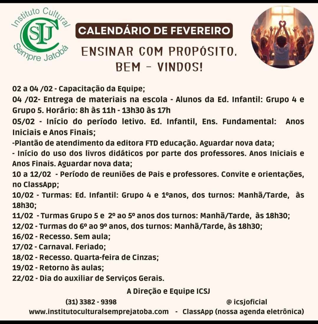 Iniciamos o ano letivo de 2026 com alegria, esperança e o compromisso renovado com a educação integral de nossas crianças e estudantes. Cada novo começo nos convida a fortalecer laços, alinhar propósitos e caminhar juntos em direção a uma formação que vá além do conhecimento, alcançando valores, atitudes e humanidade.